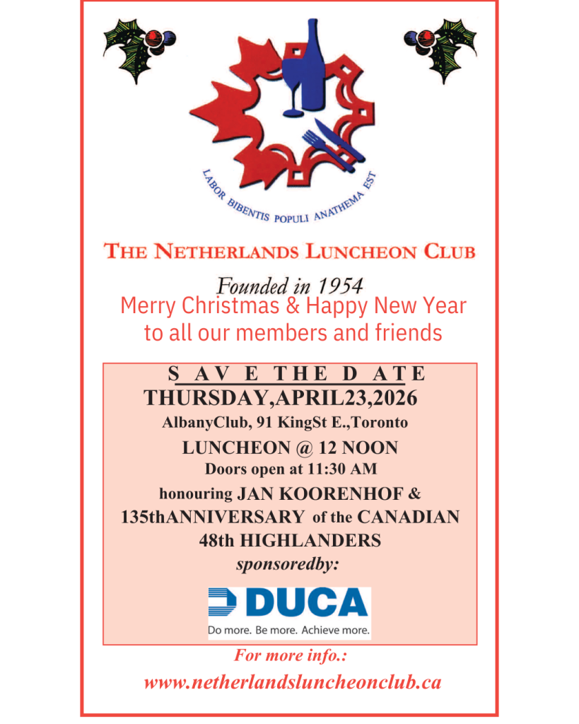 For more information, contact Henny Groenendijk by phone at 905- 465- 5771 or by email: Hennyg2020@gmail.com. Visit https://www.netherlandsluncheonclub.ca/